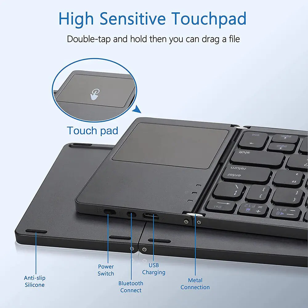 Transform your mobile devices into powerful workstations with our foldable Bluetooth keyboard featuring a built-in touchpad. The touchpad provides intuitive control, allowing you to navigate with precision and ease. Whether you're typing up emails, working on documents, or browsing the web, this keyboard delivers a seamless experience that enhances your productivity and mobile computing capabilities.
